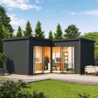 The Affric Garden Room features a sophisticated design, complemented by large glass doors that flood the interior with natural light. The clean lines and flat roof give it a stylish, minimalist exteriour look, making it a stunning addition to any garden.
