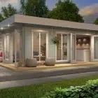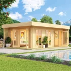 The Maree Garden Room features a spacious and airy design, highlighted by its large windows and full-length glass doors that welcome an abundance of natural light. The light wood exterior, paired with a large overhanging roof, gives this garden room a warm and inviting look, perfect for creating a peaceful retreat or an elegant entertainment space.